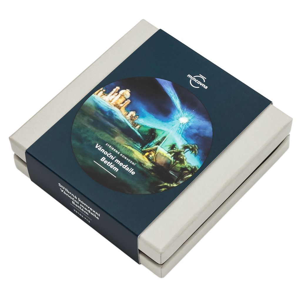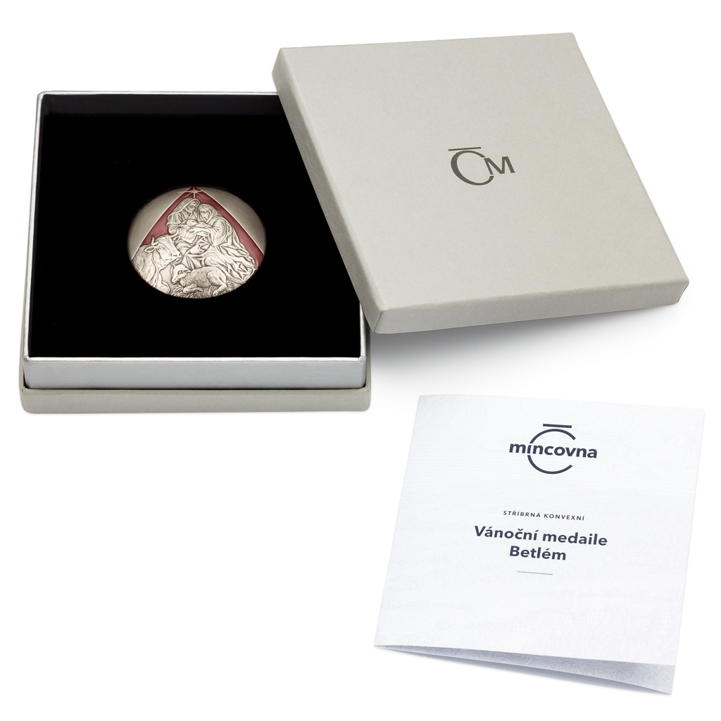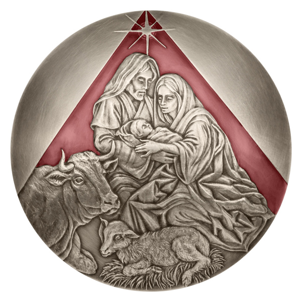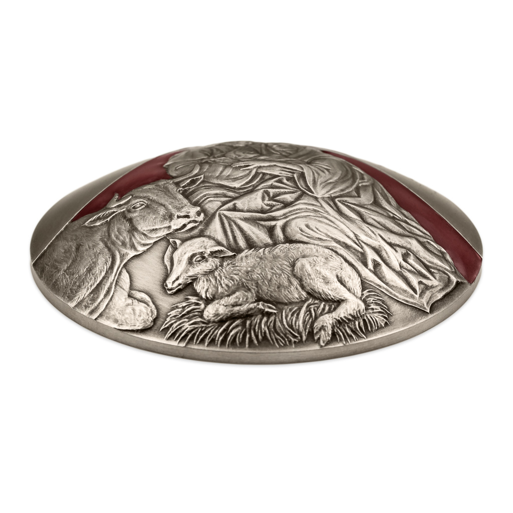 Motívom neobvyklej striebornej pamätnej medaily, ktorá vyniká vypuklým tvarom, je tradičný betlehem.