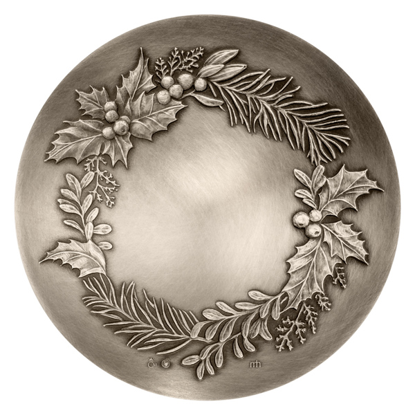 Konvexná medaila, ktorá svojím tvarom pripomína vianočnú ozdobu, je skrášlená farebným smaltom a patinou.