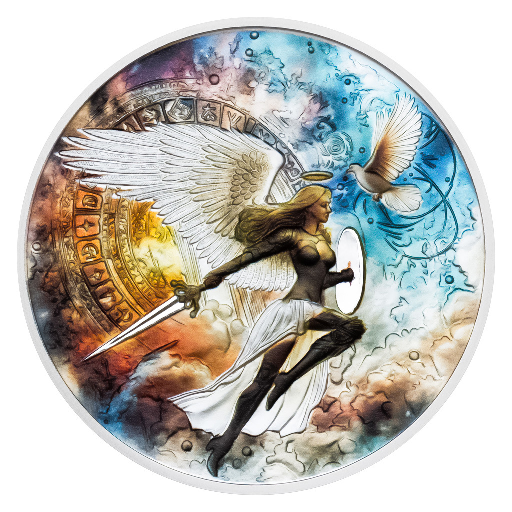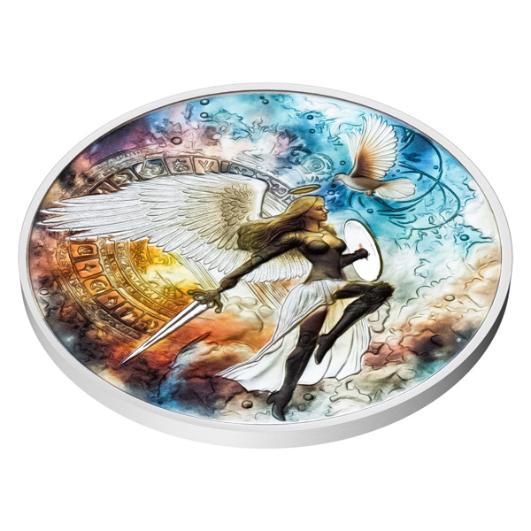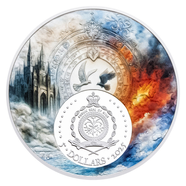 Na bohato kolorovanej reverznej strane mince vyobrazil medailér Petr Patka, DiS., zosobnené dobro v podobe plavej ženy s mečom, svätožiarou a bielymi krídlami. Bojovníčka za sebou necháva nebeské oblaky  a  v sprievode holubice vyráža skrz magický portál do boja proti zlu. Nebeské kráľovstvo nájdete aj na averznej strane mince, kde jeho žiariace veže kontrastujú s pustou pekelnou ríšou. Protiklady predstavujú aj dvaja operenci – holubica a havran, ktorých obklopujú mystické ornamenty a symboly. Pretože mince Českej mincovne vychádzajú v zahraničnej licencii ostrova Niue, nesú na averze ešte jeho štátny znak, nominálnu hodnotu 5 DOLLARS (NZD) a rok emisie 2025.